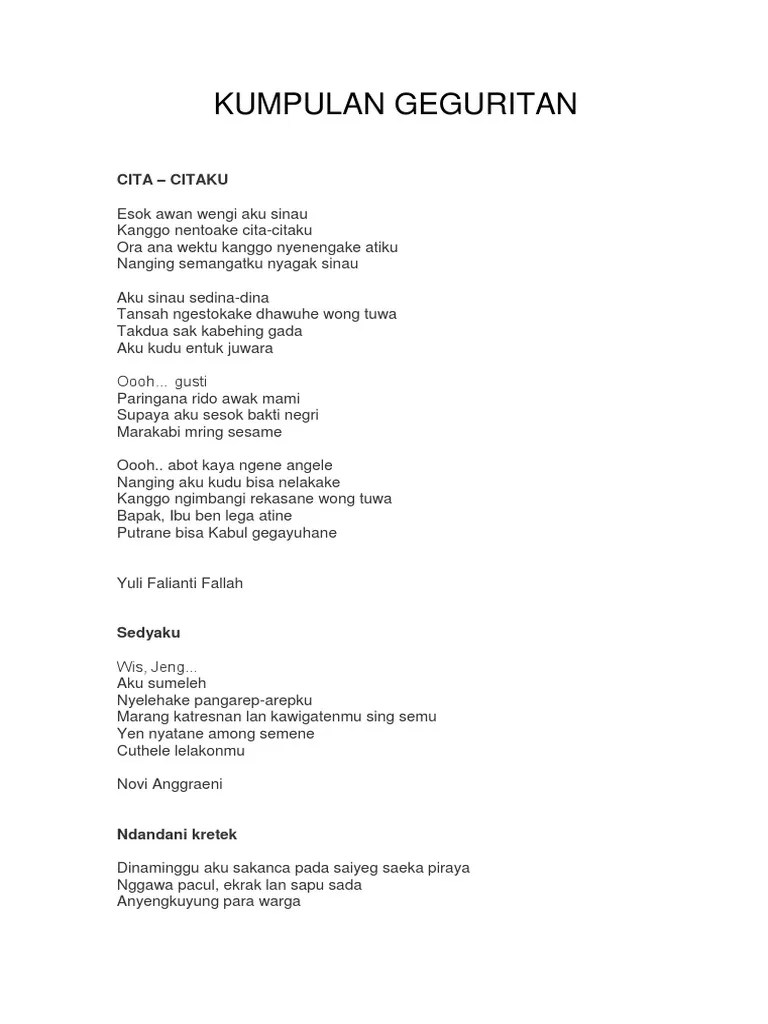 Bahasa jawa itu punya keunikan tersendiri yang mampu mengubah sebuah kalimat jadi terlihat lebih santai dan bernada candaan. Berikut adalah kumpulan contoh puisi dalam bahasa jawa atau geguritan, yang dapat kamu jadikan sebagai referensi. Memiliki arti yaitu sebuah karya sastra yang berbentuk syair atau puisi . Puisi bahasa jawa dan artinya yang membuat hati syahdu. Geguritan bahasa jawa dan artinya.