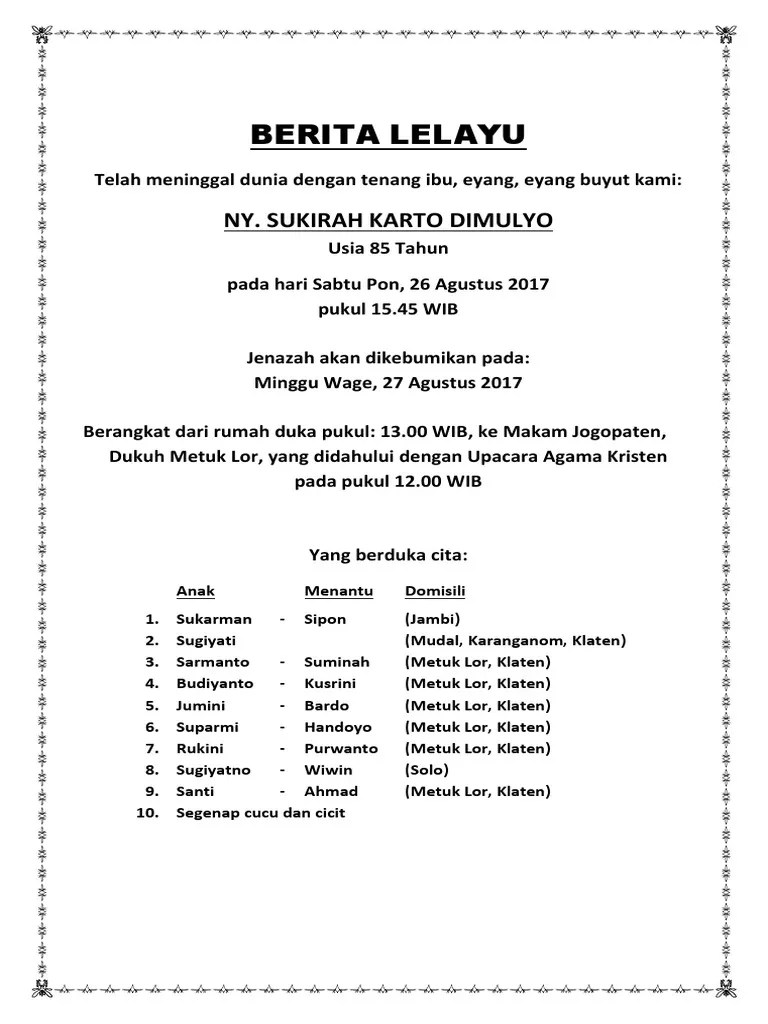 Berikut adalah contoh ucapan duka cita agama islam, kristen, katolik, budha, hindu dan khonghucu. Telah meninggal dunia pada hari minggu, 21 mei 2017, pukul 09.00 wib, di subang, ibu sri suryati, ibunda dari rekan eko . Bagi kamu yang ingin menghibur keluarga atau teman yang berduka, berikut deretan ucapan belasungkawa dan turut berduka cita simple. Karangan bunga dukacita untuk almarhum prof ofyar z tamin. Kalimat, paragraf, hingga karangan utuh. Ucapan turut berduka cita agama islam. Saat melayat atau proses pemakaman, lebih baik untuk tidak . Orang tua (ibunda) dari rekan kita fenoria putri, st, m.t. Sebagai sesama muslim, sudah sewajarnya apabila kita datang ke . Muslim woman pray on hijab praying with koran on mat indoors. Wacana berita duka untuk memberitahukan/menginformasikan siapa yang meninggal. Ucapan untuk orang meninggal islam yang menyentuh hati penuh doa.